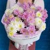 15 хризантем: хризантема кустовая белая - 7 шт., хризантема кустовая розовая  - 8 шт.,  упаковка, лента (возможна замена вида хризанетмы и оттенка розовой хризантемы от светло-розвого до темно-вишневого).